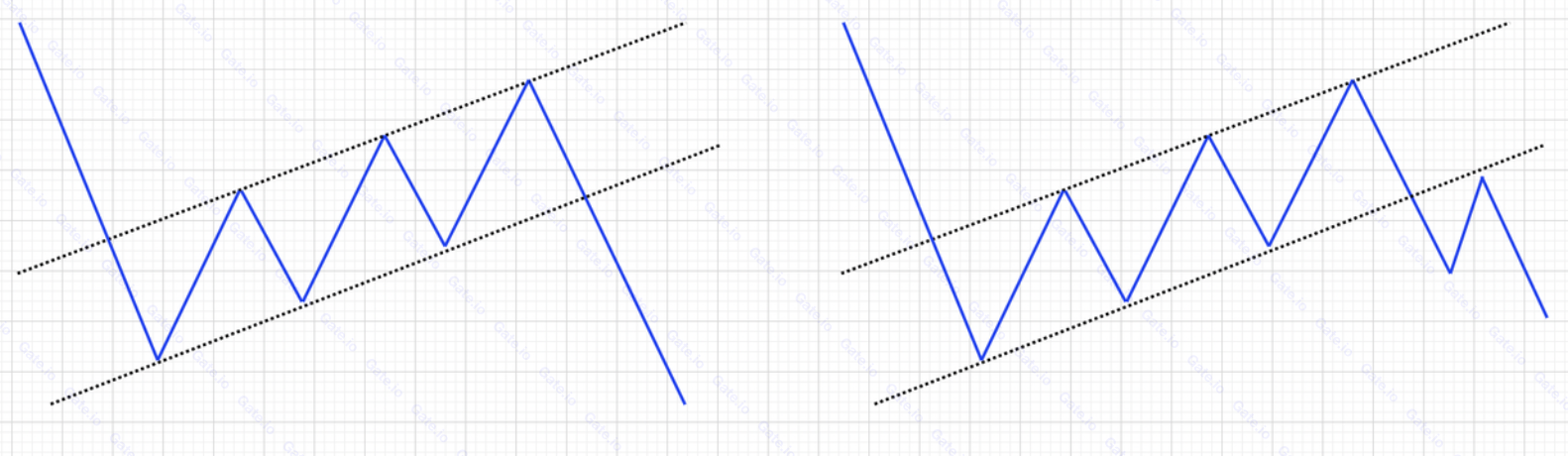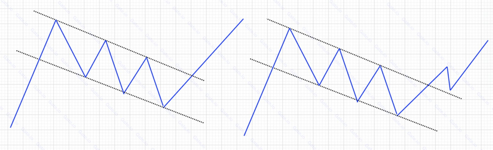 ②. ينخفض سعر العملة بشكل حاد أولاً على طول منحدر شبه عمودي، مما يشكل سارية العلم. بعد ذلك، يبدأ في الارتداد، ويتماسك بلطف ضمن نطاق يميل قليلاً إلى الأعلى. من خلال ربط النقاط العالية بالنقاط العالية في نطاق التذبذب، يمكن رسم خطين متوازيين، ليشكلا جسم نمط العلم؛