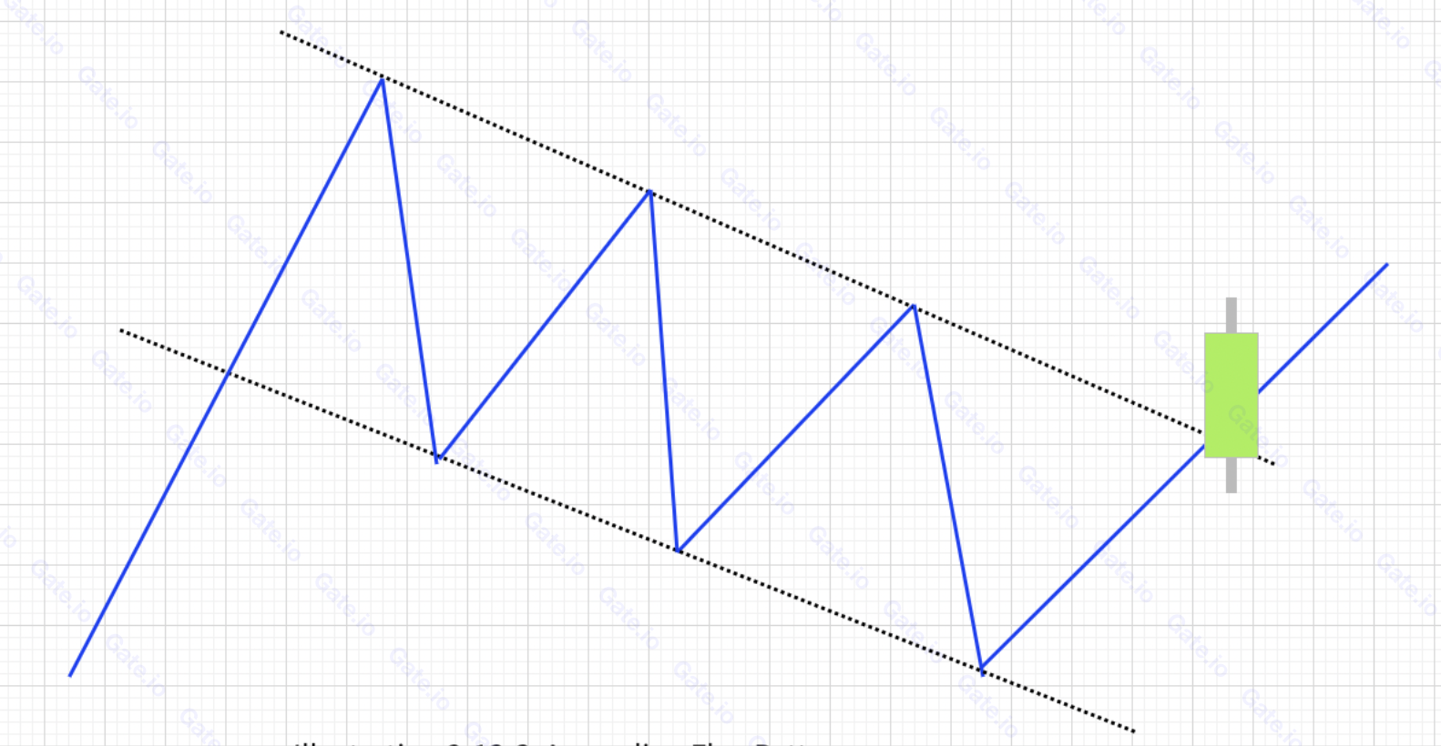 ②. يرتفع السعر أولاً، مشكلاً سارية العلم. ثم يبدأ بالتقلب ضمن نطاق معين. ومن خلال ربط الارتفاع والانخفاض في نطاق التذبذب، يتم تشكيل خطين متوازيين يشكلان جسم العلم.