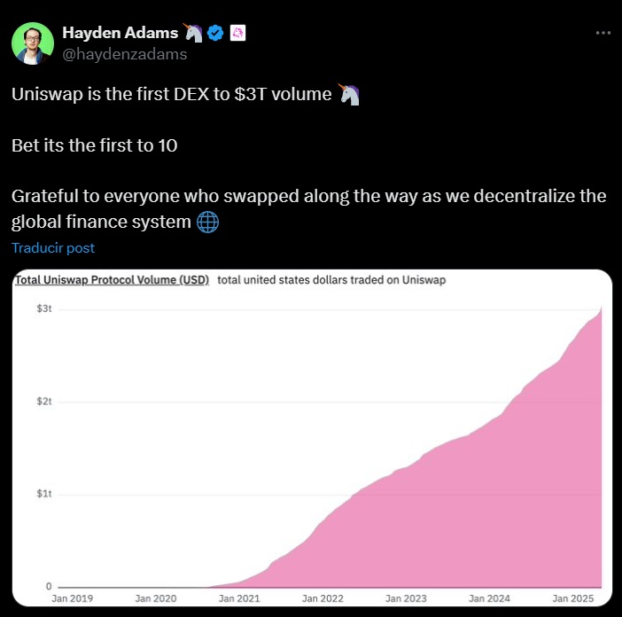 يونيسواب حققت للتو رقماً قياسياً جديداً في تاريخها كـ بورصة لامركزية. تجاوزت المنصة 3 تريليون دولار في حجم التداول التراكمي، لتصبح أول DEX تحقق هذا الرقم.