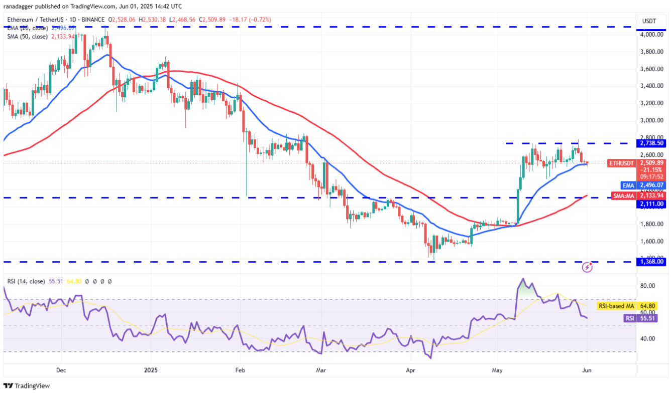 خط EMA لمدة 20 يومًا يتحرك أفقيًا ومؤشر القوة النسبية (RSI) قريب من المستوى المحايد مما يشير إلى احتمال أن السوق سيبقى في نطاق ضيق على المدى القصير. لإطلاق دورة زيادة جديدة نحو 130.000 دولار، يحتاج المشترون لدفع السعر فوق مستوى المقاومة 111.980 دولار.