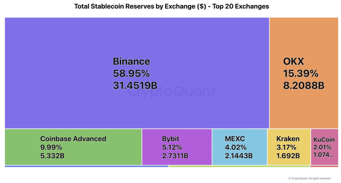 وفقًا للبيانات من CryptoQuant، تهيمن Binance على 58.95% من احتياطيات العملات المستقرة (31.45 مليار USD)، متفوقةً على OKX التي تمتلك فقط 15.39% (8.208 مليار USD)، مما يؤكد الدور المركزي لها في سوق العملات الرقمية على الرغم من الضغط القانوني الذي تعرضت له مثل دعوى SEC في عام 2023 بشأن الأوراق المالية غير المسجلة.