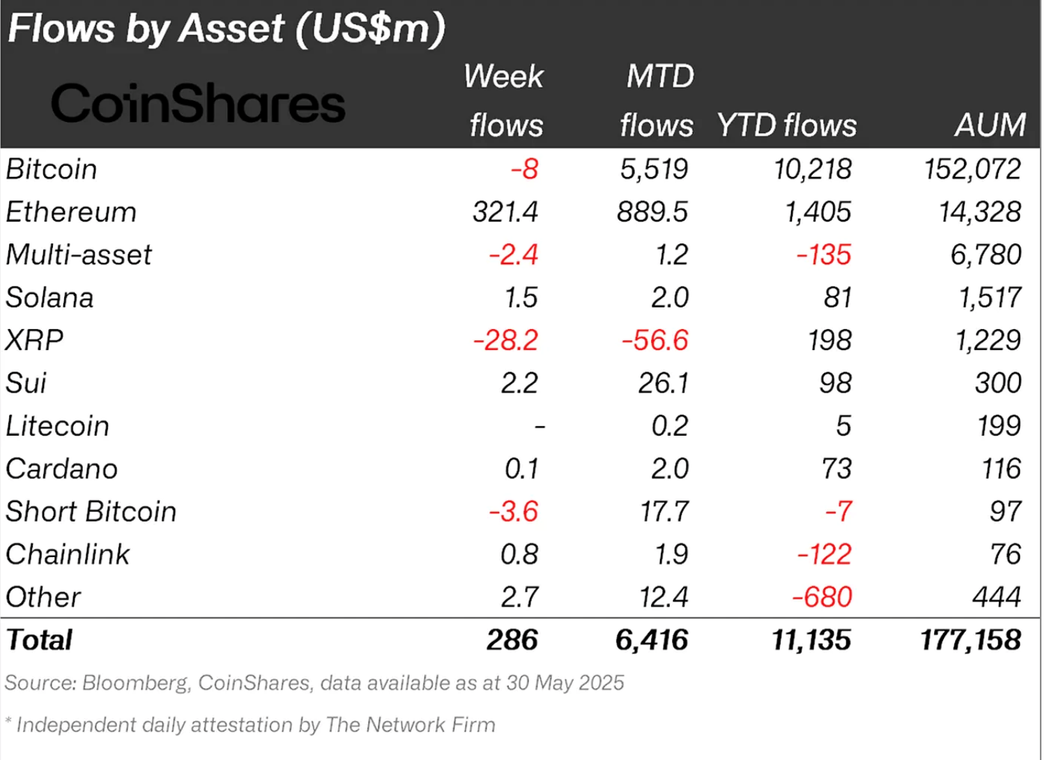 سجلت منتجات XRP ETP أكبر تراجع أسبوعي ، بلغ 28.2 مليون دولار في الأسبوع المنتهي في 30 مايو ، ليصل إجمالي التراجع للشهر بأكمله إلى 56.6 مليون دولار.