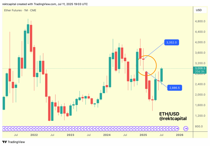 يعتبر العديد من الخبراء في السوق أن الاتجاه السعري ل ETH في الفترة المقبلة سيكون إيجابياً. وفقاً للمحلل الشهير Rekt Capital، فإن ETH حالياً يملأ الفجوة في مخطط الشموع الشهرية لـ CME، ويتواجد بين 2,900 دولار و 3,350 دولار.
