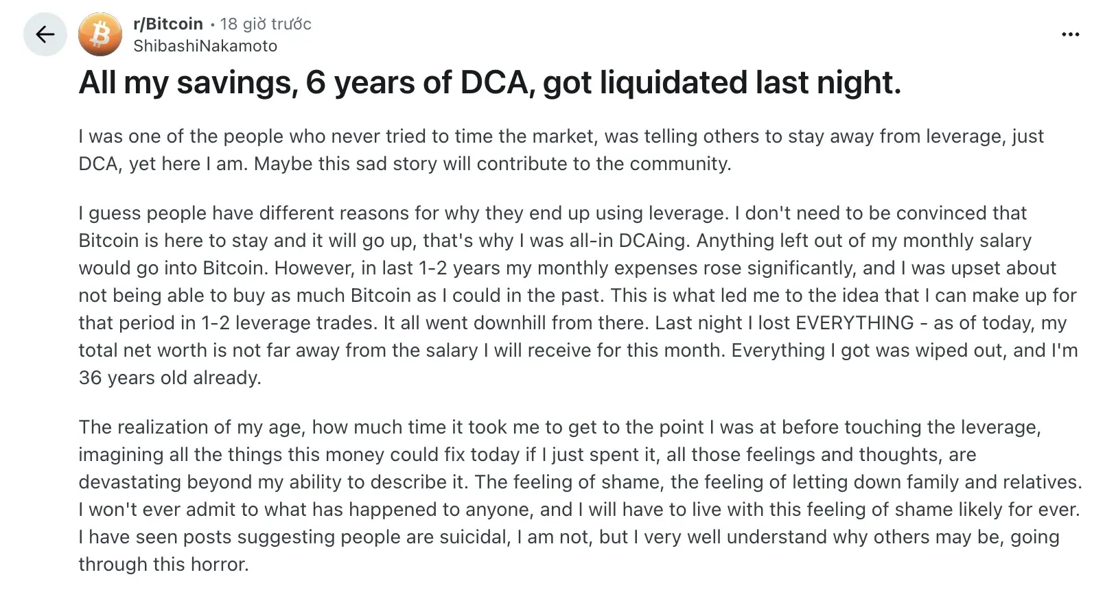 كتب الرجل البالغ من العمر 36 عامًا أنه كان دائمًا ينصح الآخرين بالابتعاد عن الرافعة المالية، يجب فقط التحلي بالصبر وDCA والاحتفاظ ببيتكوين على المدى الطويل. على مدى سنوات، كان يقوم بشراء المزيد من BTC بانتظام من أي أموال زائدة من راتبه الشهري - دون محاولة التنبؤ بالسوق، دون "الشراء عند القمة، أو البيع عند القاع".