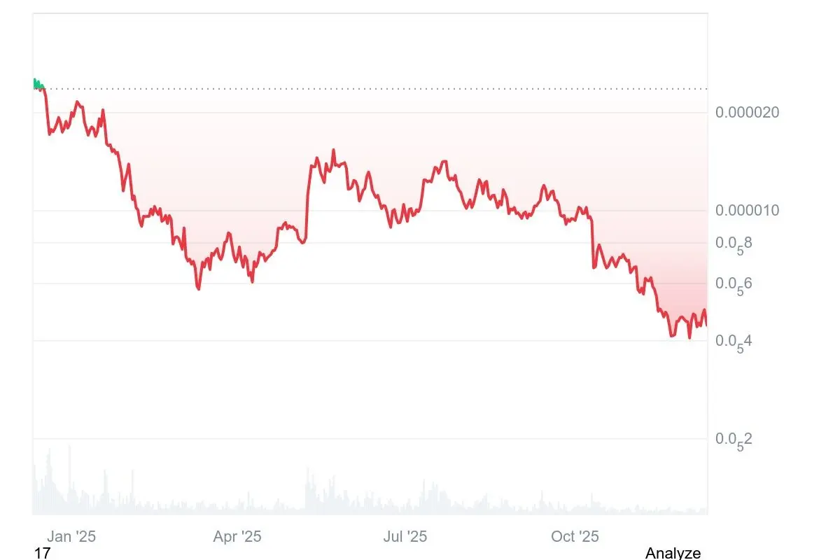انخفض سعر PEPE بنسبة 5.7% خلال الـ 24 ساعة الماضية ويهبط بأكثر من 81% خلال العام الماضي، وفقًا لبيانات CoinMarketCap.