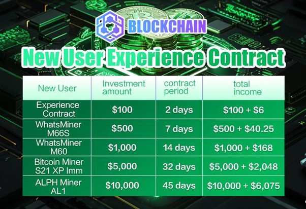 حالياً، تقدم تعدين البلوكشين مجموعة متنوعة من عقود التعدين، مثل عقود بقيمة 100 دولار، 500 دولار، و1000 دولار. تتمتع عقود التيرميناتور جميعها بعائد استثمار فريد (ROI) ومدة عقد محددة. يمكنك الحصول على المزيد من دخل الهدايا من خلال المشاركة في العقود التالية.