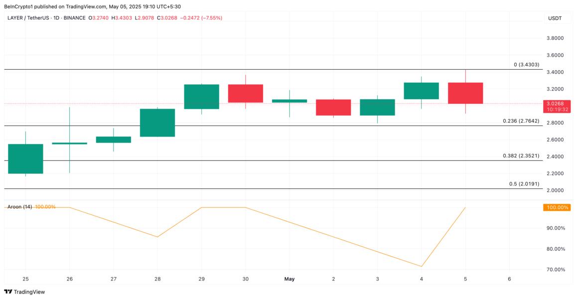 ارتفع رمز LAYER بنسبة 14% خلال الأسبوع الماضي. على الرسم البياني اليومي، تقع خط Aroon Up، الذي يقيس الزخم الصعودي، عند مستوى 100%. هذا يشير إلى اتجاه صعودي قوي وطلب كبير على الأصل. يعني خط Aroon Up عند مستوى 100 أن الأصل قد وصل مؤخرًا إلى أعلى مستوى جديد. هذا ينطبق على altcoin، الذي تم تداوله في بداية يوم الاثنين عند أعلى مستوى تاريخي $3,43.
