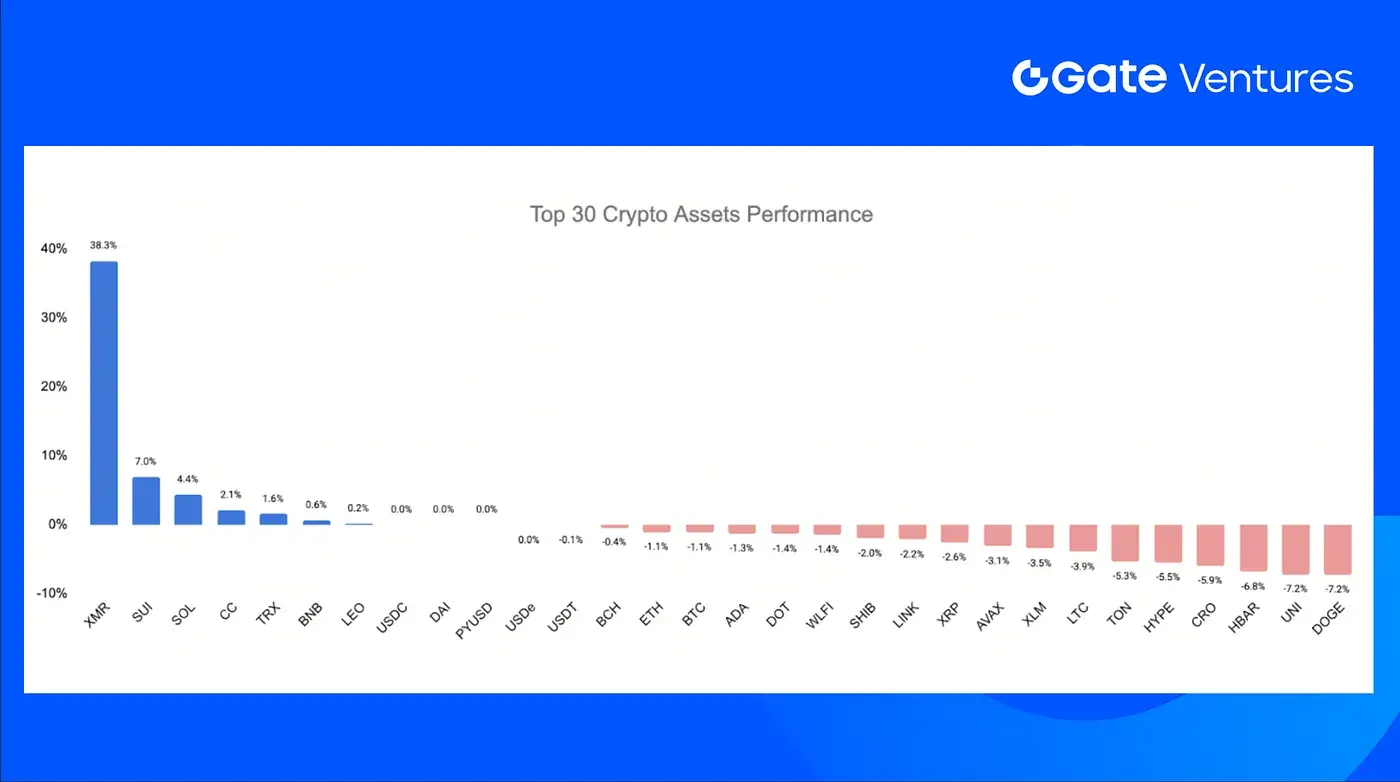 كانت أفضل 30 عملة رقمية بشكل عام مستقرة، بانخفاض متوسط قدره 0.85%. تفوقت XMR بشكل واضح على المجموعة، مع مكاسب، تليها SUI وSOL.