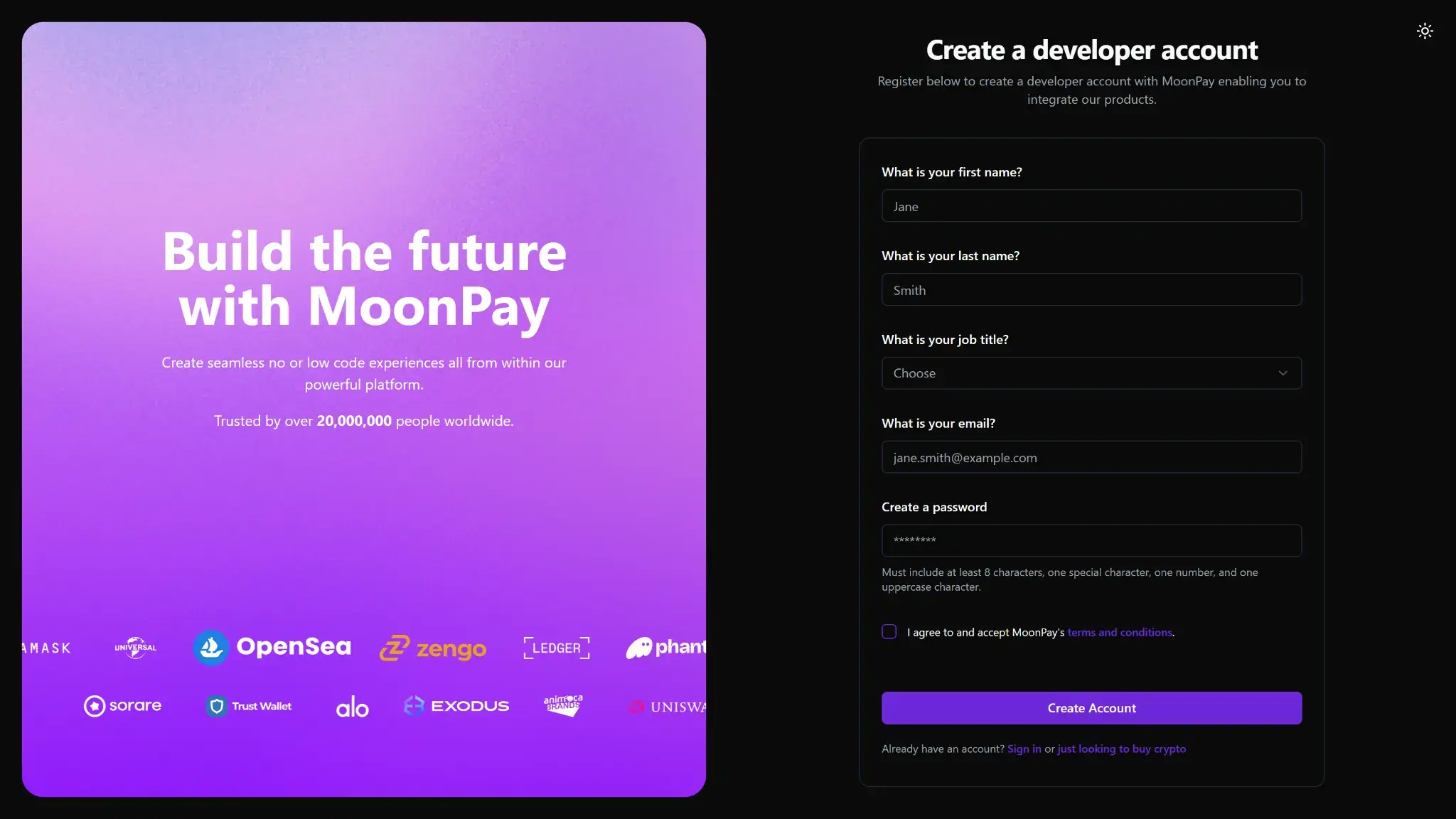 Página de registro de cuenta de desarrollador de MoonPay con formulario y banner “Construye el futuro con MoonPay”.