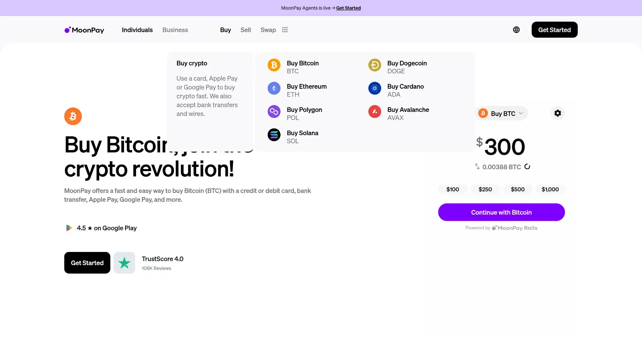 Página de “Comprar Bitcoin” de MoonPay mostrando el widget de pago de MoonPay Rails con preajustes de monto y botón de Continuar.