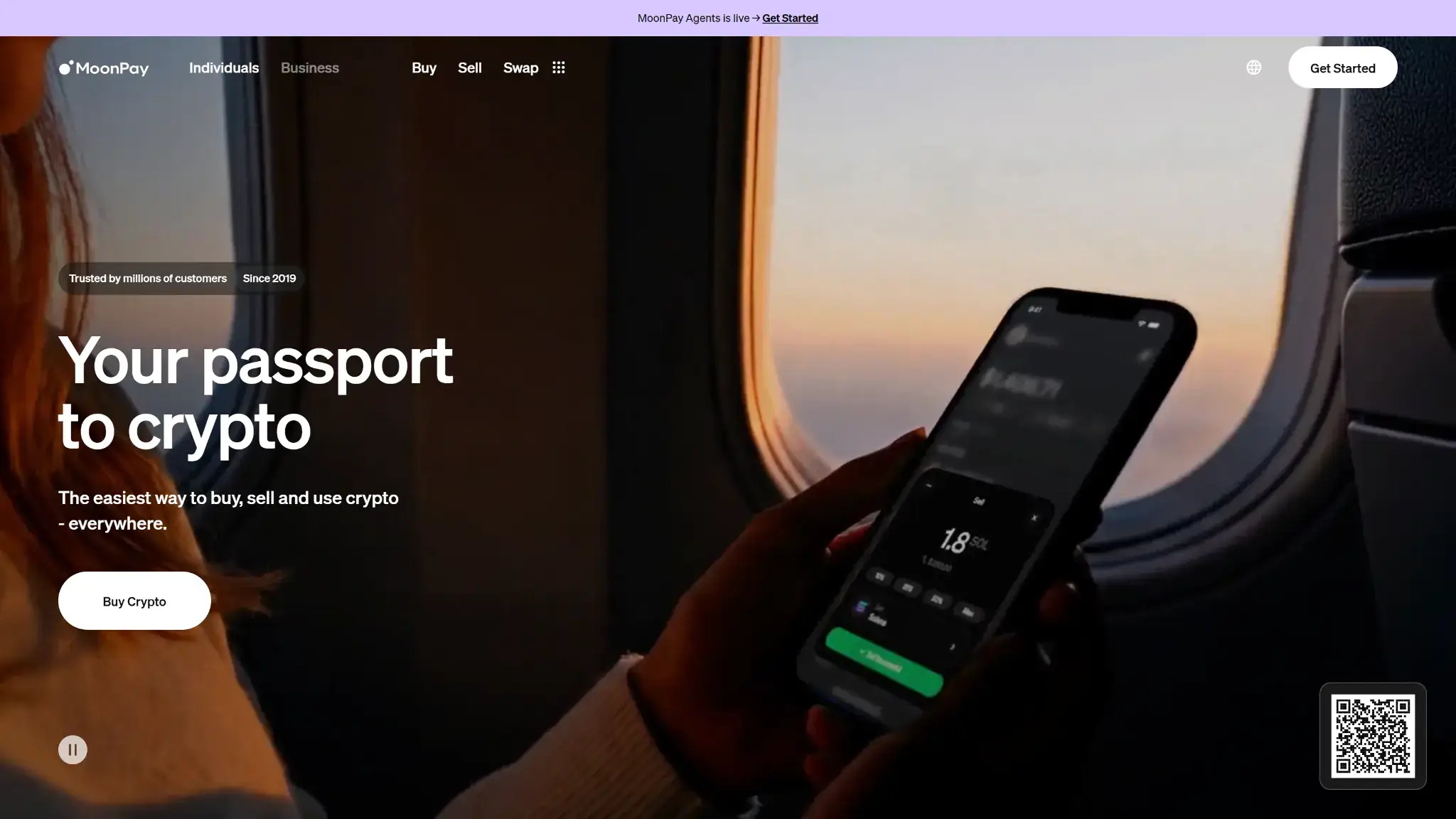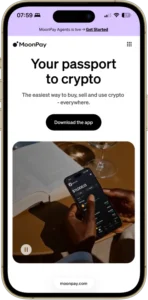 La página principal de MoonPay muestra el texto “Tu pasaporte al cripto” con un botón de Comprar Cripto y vista previa de la app.
