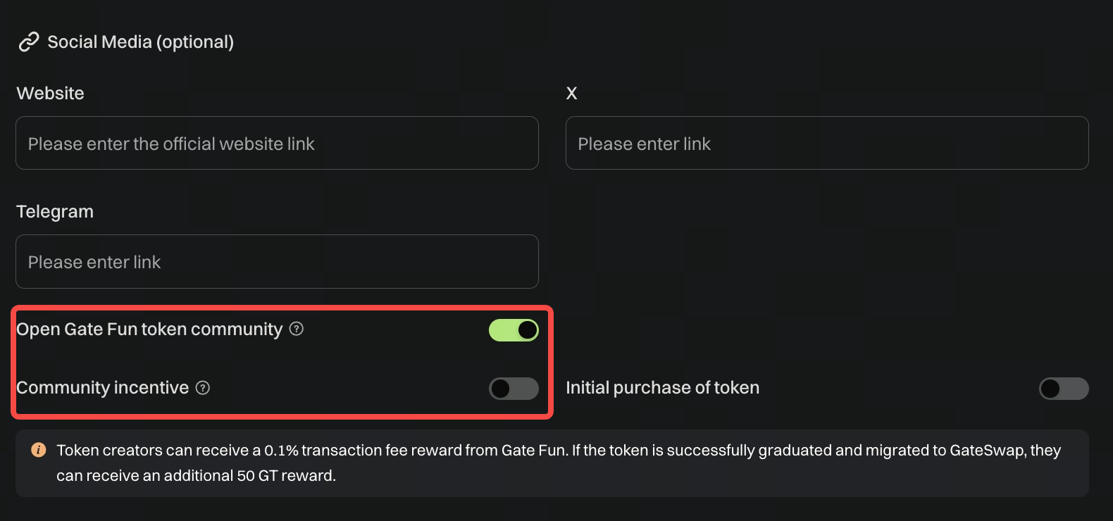 La création de tokens est simplifiée. Tout utilisateur émettant des tokens via Gate Fun peut cocher l’option « Activer la communauté Gate Fun Token »—aucun frais supplémentaire ni configuration technique n’est requis. Gate Fun génère automatiquement une page communautaire dédiée à chaque token sur la plateforme web.