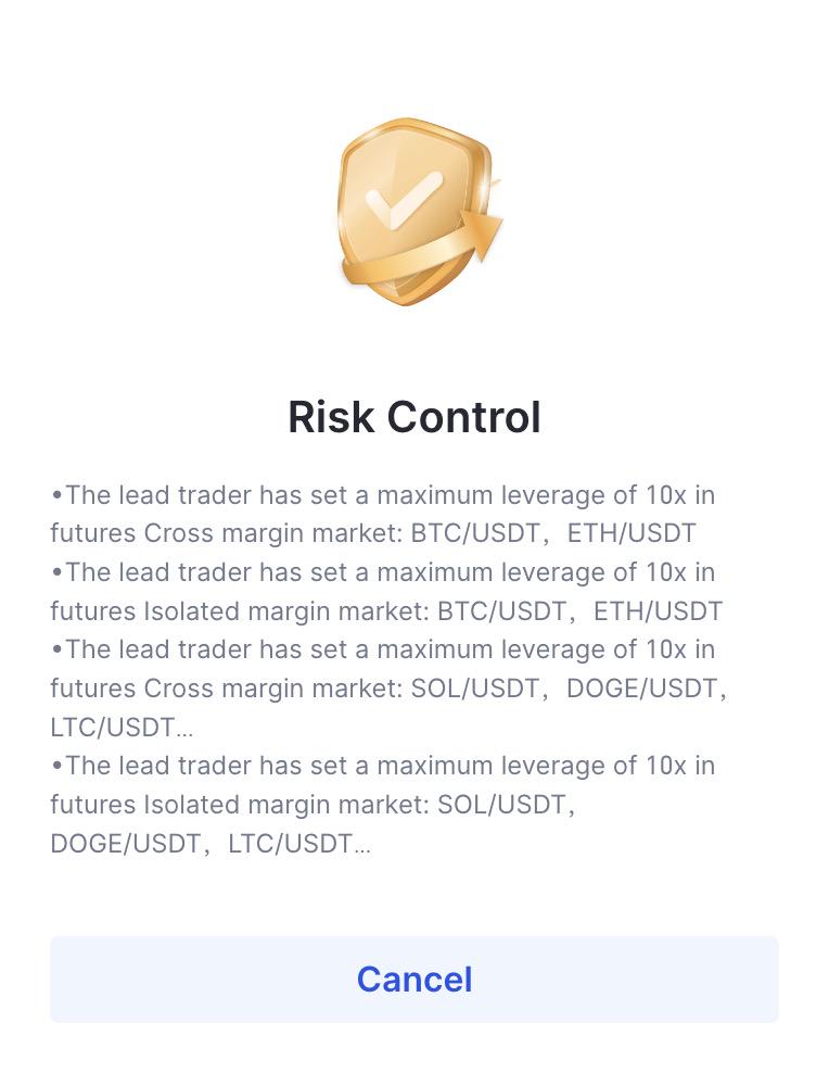 Trader utama Copy Trading dapat menetapkan Batas Maksimum Leverage dari berbagai token Perpetual Futures(satu untuk BTC & ETH dan satu lagi untuk token lainnya)。Setelah diatur,trader utama hanya akan diizinkan untuk berdagang di bawah batas tersebut,sehingga mengurangi risiko perdagangan mereka dan penyalin。