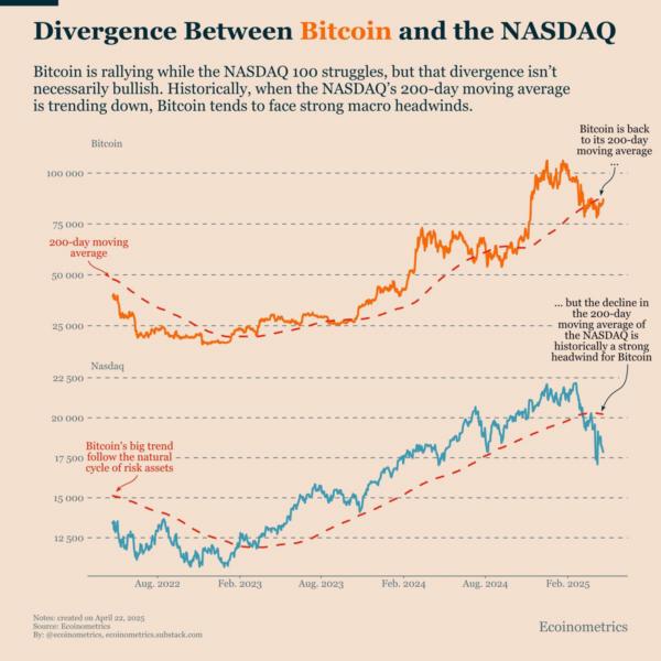 Tuur Demeester, penasihat Blockstream, menunjukkan satu lagi divergensi: bitcoin telah berhenti mengikuti indeks NASDAQ, yang mencerminkan saham perusahaan teknologi. Sebelumnya, bitcoin sering bergerak searah dengan NASDAQ karena hubungan dengan teknologi dan suasana umum di pasar. Pada bulan April tahun ini, semuanya berubah, dan para ahli menganggap ini sebagai sinyal positif. Namun, tidak semua orang setuju dengan pendapat ini. Misalnya, platform Ecoinometrics memegang pandangan yang berlawanan.