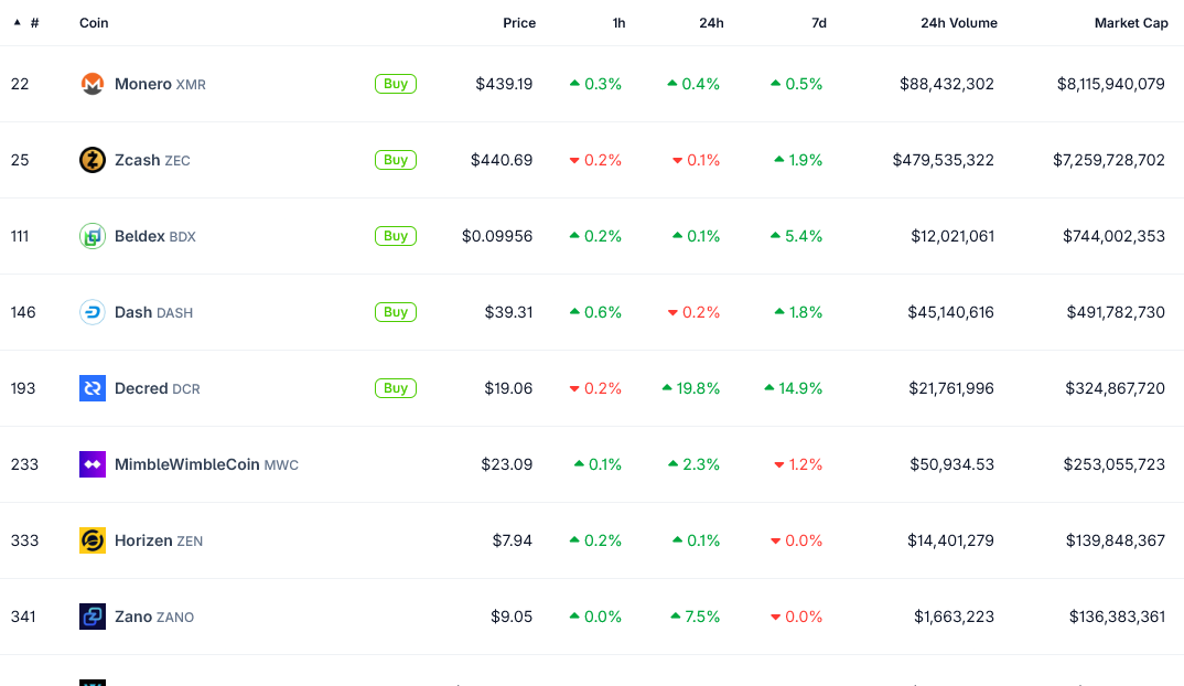 Koin Privasi Teratas berdasarkan Kapitalisasi Pasar. Sumber: CoinGecko