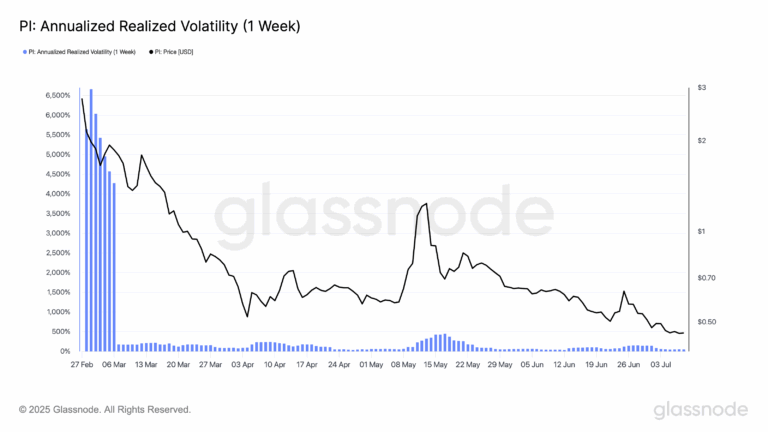Pi 通貨の1週間の実際な変動率は2月に歴史的な高値を記録した後、大幅に上昇しました。しかし、Glassnodeの最新データによれば、過去2ヶ月間のボラティリティは安定して低下しています。