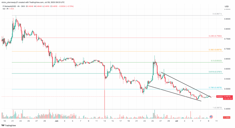 テクニカル面から見ると、4時間足チャートではPI通貨の価格下落が下降ウェッジを形成しています。しかし、この記事執筆時点では、この暗号通貨はウェッジの上昇トレンドラインをブレイクしようとしています。