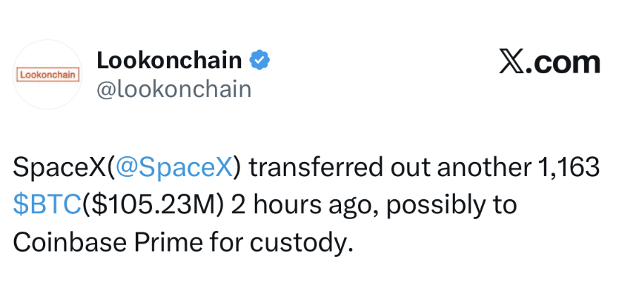 ソース: DefiPlanet 原題: SpaceXが1,163 BTCを移転し、保管のアップグレードを示唆 オリジナルリンク: https://defi-planet.com/2025/11/spacex-transfers-1163-btc-signals-custody-upgrade/