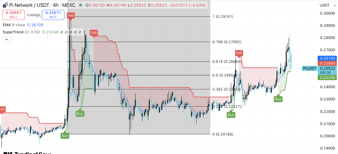 PIは9 EMAを上回っており、これは最近のブレイクアウト中に動的サポートとして機能しました。トレーダーは、PIが$0.2520ゾーン以上に留まる限り、現在のプルバックが制御され続けることを期待しています。このレベルはSuperTrendサポートと一致しており、買い手が日中の下落時にこれを守れば、継続的な強さを示すシグナルとなります。
