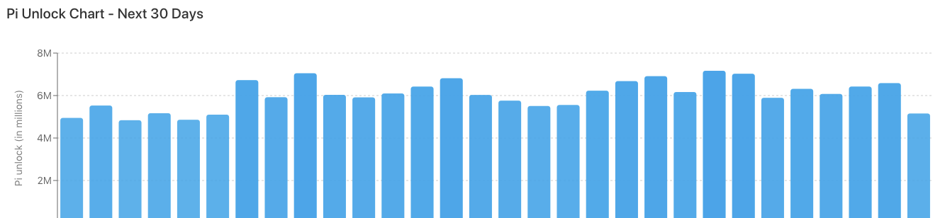Pi Networkの最新のロック解除データによると、50億以上のロックされたPiがあり、約12億8千万ドルの価値があります。今後30日間には、1億8千万以上のPiがリリースされる予定です。このボリュームはロック供給量の約3.6%に相当します。平均日次ロック解除量は600万Pi近くで、約154万ドルの価値があります。最もロック解除が行われた日は710万Piを超えます。