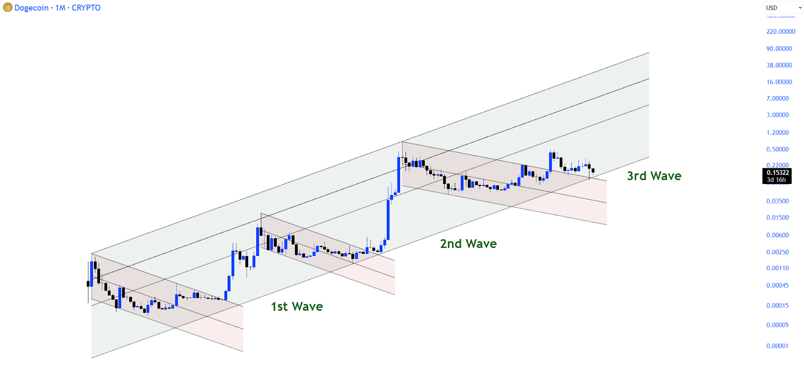 Xの暗号アナリストによると、ドージコインの価格は第3波のドレッドロックの中に閉じ込められています。この暗号アナリストは、2017年と2021年の過去2回の主要なブルサイクルに基づいて強気のシナリオを立てました。