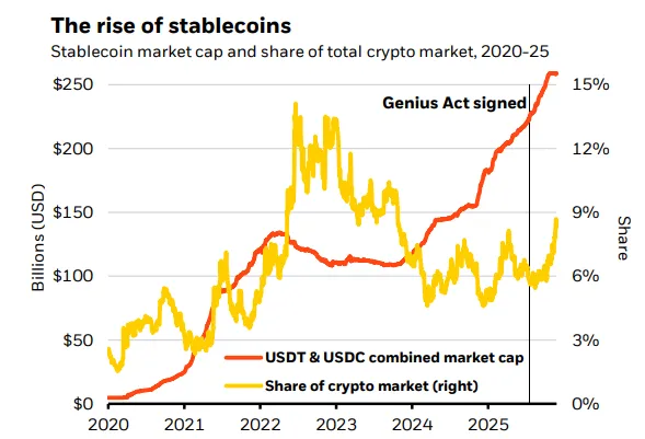 # ブラックロックはステーブルコインを伝統的金融への架け橋と位置付けブラックロックのアナリストは、仮想通貨の影響と米国の国債増加による金融システムの変革について言及しました。同社のレポートによると、「ステーブルコイン」はデジタル経済と伝統経済の橋渡し役となっています。専門家は、ステーブルコインがもはや暗号トレーディング専用のツールではなくなったと強調しました。2025年11月までに市場規模は$250 億ドルを超えました。アクティブは国際送金や日常の支払いにもますます利用されています。出典:ブラックロックのレポート。同レポートでは、米国でGENIUS法が成立し、決済用「ステーブルコイン」に初の規制枠組みが設けられたことも言及されています。発行者はマーケティング報酬の利用が認められ、銀行預金やマネーマーケットファンドの競争相手となりました。ブラックロックは、デジタル資産への大量の資本流出が経済の融資メカニズムを変える可能性があると指摘。銀行は流動性の一部を失うリスクがあります。さらに、発展途上国ではステーブルコインが弱い自国通貨の代替となっています。これによりドルへのアクセスが拡大する一方で、現地中央銀行の金融政策は難しくなります。ブラックロックは他にも以下の主要トレンドを挙げています。1. **AIとエネルギー。** 人工知能の発展は物理的な制約に直面しています。2030年までにデータセンターが米国の全電力消費の最大25%を占める可能性があります。2. **政治。** 世界は第二次世界大戦後「第三の世界秩序」に突入しました。米中関係がグローバルアジェンダを左右し、欧州は防衛支出を増加させています。3. **投資。** 同社はAI発展を背景に米国株式に対して引き続き前向きな見通しを維持しています。レポートでは米国の国債問題にも触れています。ブラックロックのアナリストは、長期国債をもはやポートフォリオの安全資産とは見なしていません。増大する財政赤字を背景に、投資家へは代替ヘッジ手段の検討を推奨しています。## ラリー・フィンクとビットコインブラックロックのCEOラリー・フィンクは、自身の仮想通貨観の劇的な変化について説明しました。NYT DealBookサミットで、業界への厳しい批判から最大規模の現物ビットコインETFの立ち上げに至るまでの経緯を語りました。フィンク氏は、デジタル資産をマネーロンダリングと結びつけていた時期から、デジタルゴールドで数十億規模の資産を運用するに至ったことが「信念転換の鮮やかな公開例」だったと認めました。ブラックロックCEOによれば、「自分の思考プロセスは常に進化している」とのことです。フィンク氏はビットコインを「恐怖のアセット」と表現。米中の貿易協議や地政学的緊張の緩和といった市場に確実性が生まれると、ビットコイン価格が下落する傾向があると指摘しました。また、短期投資家にリスクへの注意も呼びかけています。フィンク氏はビットコインが極めてボラティリティの高い商品であり、成功するには市場への完璧な感覚が必要だが、「大半の人はそれを持っていない」と述べています。なお、11月には同社の暗号資産部門責任者ロバート・ミッチニック氏が、世界最大手運用会社の多くの顧客はデジタルゴールドを決済手段とは見なしていないと述べています。