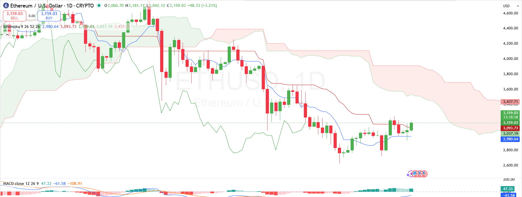 イーサリアムの日足チャートは、中立的なテクニカル見通しを示しています。現在価格は$3,200付近の主要なレジスタンスを試しており、Ichimoku雲では価格が雲のレンジ内を推移しています。$3,093が直近のサポート、$3,437.71が上部レジスタンスとして機能しています。