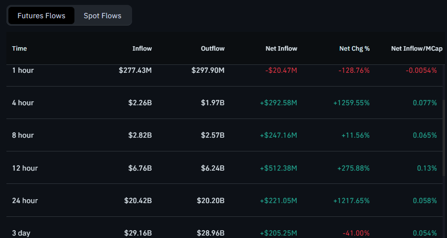 3日間データでは、$29.16Bの流入と$28.96Bの流出により、$205.25Mの純流入が見られます。しかし、このデータは-41.00%の変化を示しており、短期の期間と比べて純流入のペースが鈍化していることを反映しています。