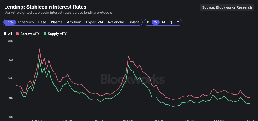 出典: Blockworks 原題: レンジ相場と堅調なオンチェーンレンディング 原文リンク: https://blockworks.co/news/rangebound-markets-resilient暗号資産価格は短期的にわずかな回復を示しているものの、月次では幅広くネガティブな動きとTradFiベンチマークに対する相対的なアンダーパフォーマンスが続き、依然として弱気環境が支配的です。視野を広げると、ステーブルコインとレンディング分野は数年にわたる成長が期待できる耐久性のあるセクターとして世俗的成長トレンドを示しています。## インデックス暗号資産市場は11月の大幅な下落後、依然としてレンジ相場が続いています。先週はわずかな回復を見せ、BTCは現在$90,400で、直近の下落時の安値$80,700から12%上昇しています。直近24時間ではAIとモジュラー分野がトップの勝者となり、TAO (+6.4%)とTIA (+6.2%)がこの短期的な強さの主な貢献銘柄となっています。パーペチュアルインデックスは最大の敗者で、DYDX (-3.1%)とHYPE (-0.6%)がセクターの弱さの要因となりました。月次で見ると状況は依然として芳しくありません。ゴールド、ナスダック、S&P 500などのTradFiベンチマークはいずれも過去1ヶ月でプラス推移していますが、追跡しているすべての暗号資産インデックスはマイナスリターンとなっています。すべての暗号資産インデックスで月次の広がりは明確にネガティブで、安全な避難先はありません。特に、プロトコル収益インデックスが暗号資産セクターの中で最も高いパフォーマンスを示しており、ファンダメンタルが強いプロトコルの相対的な強さを示唆しています。最近の強さにもかかわらず、この上昇が長期的な下落トレンドに対するカウンタートレンドなのか、あるいは2025年残りの期間の底入れなのかは、まだ判断できません。## マーケットアップデート下落トレンドの中でも、全体像を見失わず、ここまでの進展に目を向けてみましょう。ベアマーケットの底では、DeFi内のレンディングアプリケーションの預かり資産はわずか$5 億ドルで、金融システム全体から見れば誤差の範囲でした。それ以降、預かり資産は$71 億ドルに成長し、直近では$100 億ドルに迫る規模にまで拡大しています。同様に、これらアプリケーションの貸付残高もベアマーケット最安値時には16億ドルでしたが、それ以降、アクティブローンは現在$27 億ドルを超えており、最近$38 億ドルを突破しました。これらの数値は、暗号資産ネイティブ以外の人にとっても注目に値する規模へと成長しています。ボラティリティは両方向に働きますが、数年で20倍のトップライン成長は、このセクターがまだ最終的な成長率には程遠いことを示唆しています。暗号資産価格の下落局面でも、ステーブルコインの総供給量は-$310 億ドルの流出を経て、過去最高の$10 億ドルまで回復しています。ステーブルコインの成長は、私が逆張りしたくないトレンドです。オンチェーンマネーマーケットは増加するステーブルコイン供給の主な受益者であり、主な活用先となっています。ステーブルコイン貸し手は利回りを求め、借り手はレバレッジを求めます。スポット資産のボラティリティが続く一方で、この世俗的なトレンドはDeFiアプリケーションにとって持続的かつ強力な追い風となるはずです。特筆すべきは、ステーブルコイン供給の成長が非常に控えめなオンチェーン利回りの中で進行している点です。レンディングアプリケーションの基準供給利率は3.6%で、SOFRの3.9%よりも低いです。オンチェーンステーブルコイン流動性の深さが増すことで供給利率の上昇は抑えられ、従来型金利に対する実質的なリスクプレミアムがない場合、マネーマーケットにおけるステーブルコイン活用の成長が鈍化する可能性もあります。