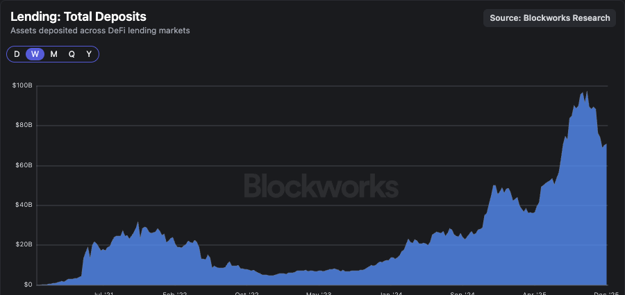 下落トレンドの中でも、全体像を見失わず、ここまでの進展に目を向けてみましょう。ベアマーケットの底では、DeFi内のレンディングアプリケーションの預かり資産はわずか$5 億ドルで、金融システム全体から見れば誤差の範囲でした。それ以降、預かり資産は$71 億ドルに成長し、直近では$100 億ドルに迫る規模にまで拡大しています。