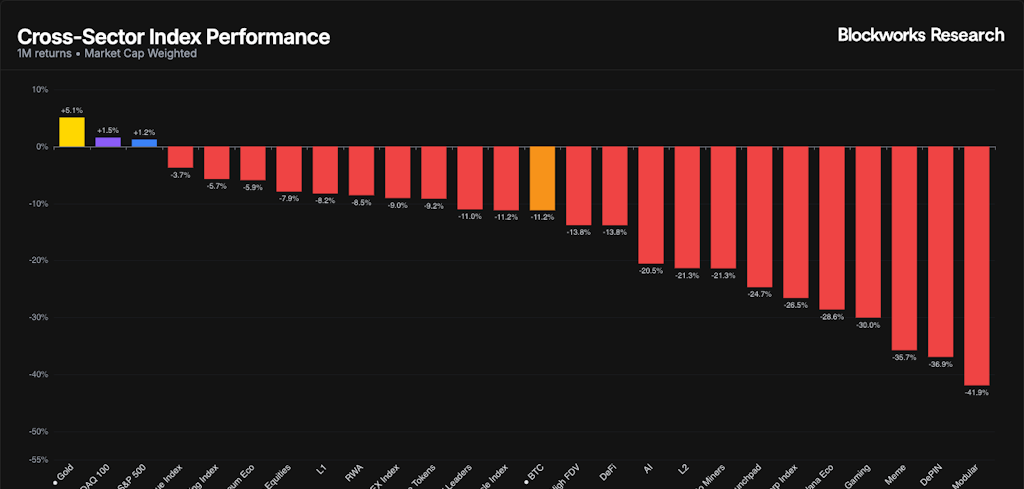 月次で見ると状況は依然として芳しくありません。ゴールド、ナスダック、S&P 500などのTradFiベンチマークはいずれも過去1ヶ月でプラス推移していますが、追跡しているすべての暗号資産インデックスはマイナスリターンとなっています。