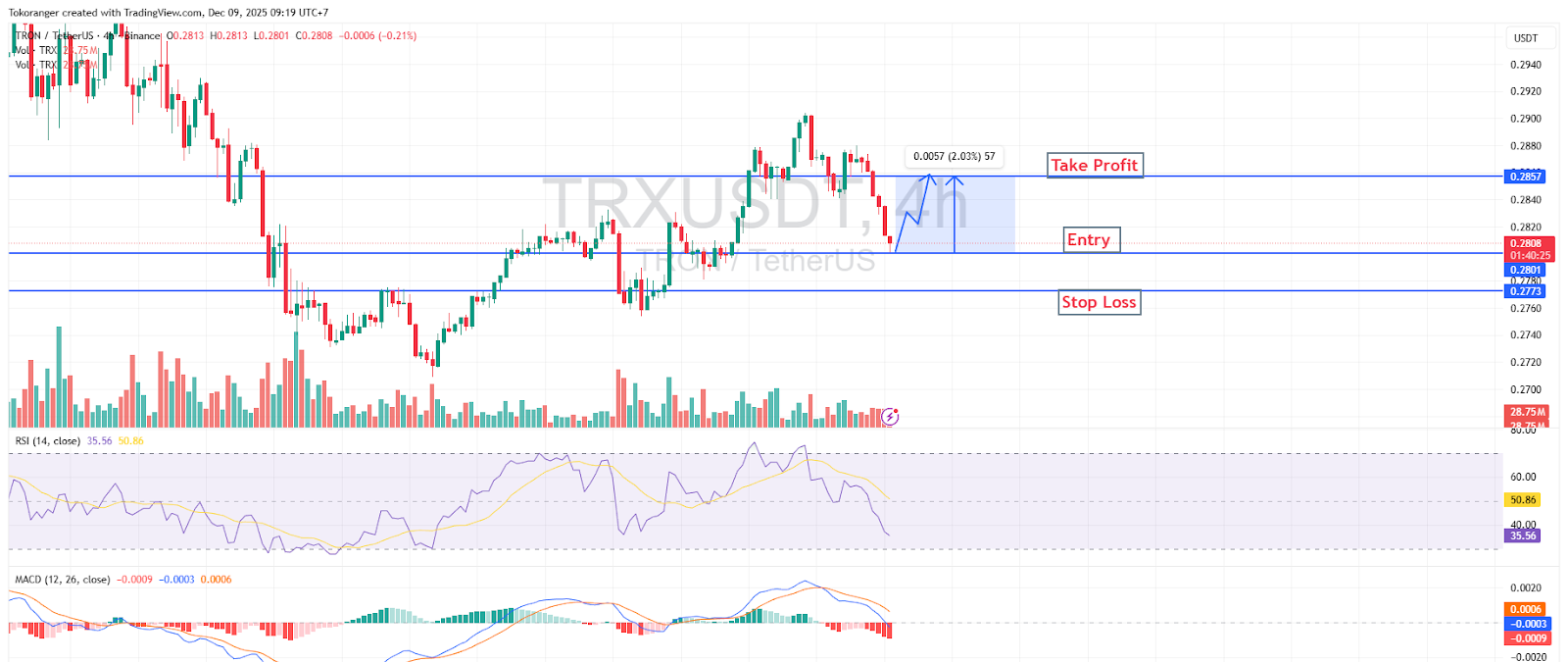 TRXは現在、急落後の$0.2780〜$0.2800の需要ゾーン(support)をテストしています。1時間RSIも売られ過ぎ領域に低下しており、リバウンドの可能性が高まっています。一方、MACDは下落の勢いが鈍化し始めており、売り圧力の弱まりを示しています。価格が$0.2773以上を維持できれば、$0.2857のレジスタンスに向かう回復シナリオが最も妥当です。