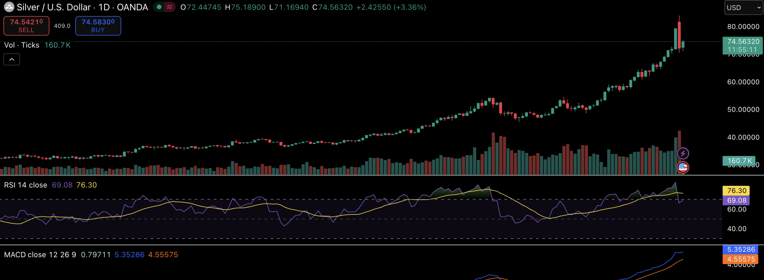 その後、銀は損失の一部を取り戻し、執筆時点で約74.62ドルで取引されており、当日の上昇率は約4.82%です。反発は、強制売却がほぼ終了し、押し目買いが戻りつつあることを示唆しています。