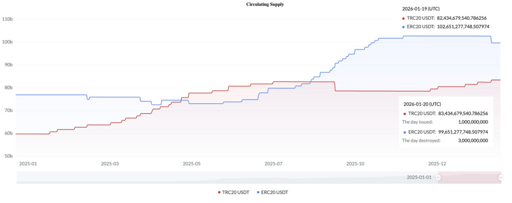 2026年1月19日、トロン(TRC-20)のUSDTは82,434,679,540トークンを記録した。1日後の1月20日には、その数値は83,434,679,540に跳ね上がった。この変化は1億ドルのUSDTがトロン上で直接ミントされたことを示している。