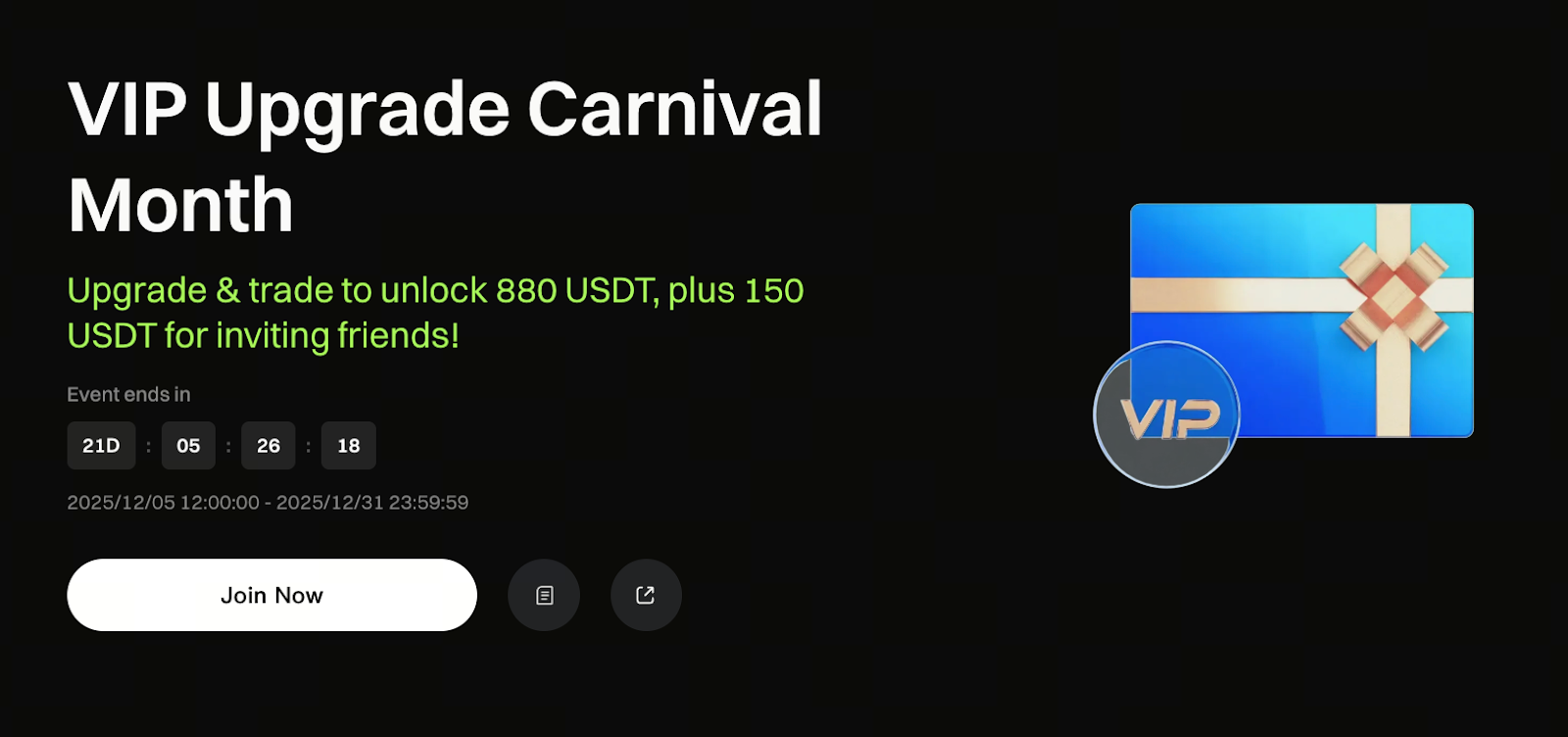 During the event, users who upgrade to VIP 5 for the first time receive twofold benefits. Upon a successful upgrade, you’ll instantly receive a 30 USDT cash airdrop. If you reach VIP 5 by completing trading tasks during the campaign, you’ll earn an additional 50 USDT reward. This structure is designed to help new users launch their investment journey and maximize returns in the shortest possible time.