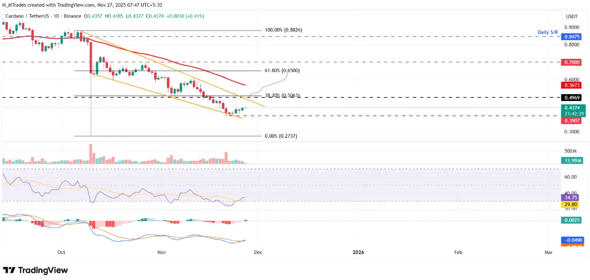 Samedi, le prix de Cardano (ADA) a testé et trouvé un support près de la ligne de tendance inférieure du modèle en coin baissier – formé en reliant les sommets et les creux par deux lignes de tendance – avant de rebondir de 9 % au cours des quatre jours suivants. Au moment de la rédaction, jeudi, l'ADA oscillait autour de 0,43 USD.