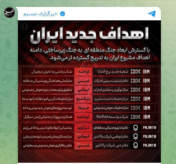 先週火曜日、イランのタスニム通信は、米国主要テクノロジー企業のリストをSNSに掲載し、その中にはアマゾン、マイクロソフト、パランティア、オラクルが含まれているとし、「敵の技術インフラ:イランの新たな標的」と添えている。
