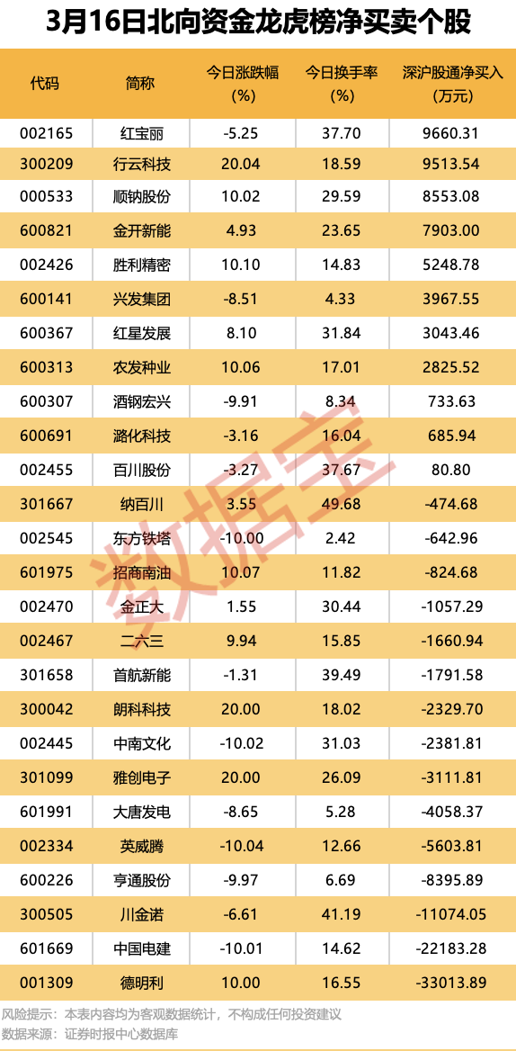 Among the stocks on today’s top list, 11 received net buy-ins from northbound funds. Hongbaoli and Xingyun Technology led with net purchases over 95 million yuan each; Shunna Shares, Jinkai New Energy, and Victory Precision also saw net buy-ins exceeding 50 million yuan.