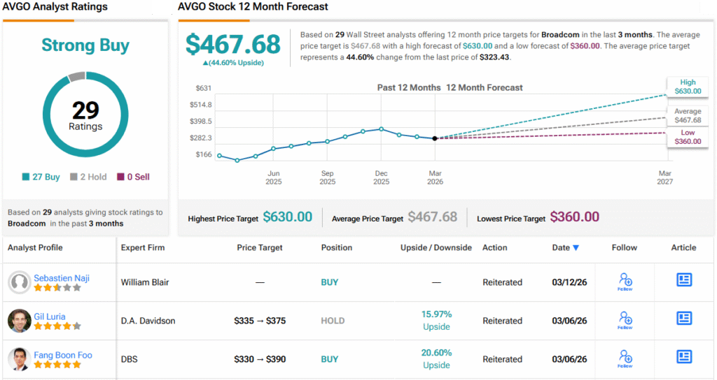 That is also the conclusion reached by most Street analysts; based on 27 Buys vs. 2 Holds, AVGO claims a Strong Buy consensus rating. At $467.68, the average price target factors in 12-month returns of ~45%. (See AVGO stock forecast)