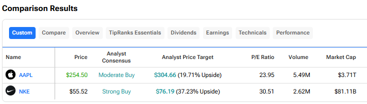 Turning to Wall Street, out of the two stocks mentioned above, analysts think that NKE stock has more room to run than AAPL. In fact, NKE’s price target of $76.19 per share implies 37.2% upside versus AAPL’s 19.7%.
