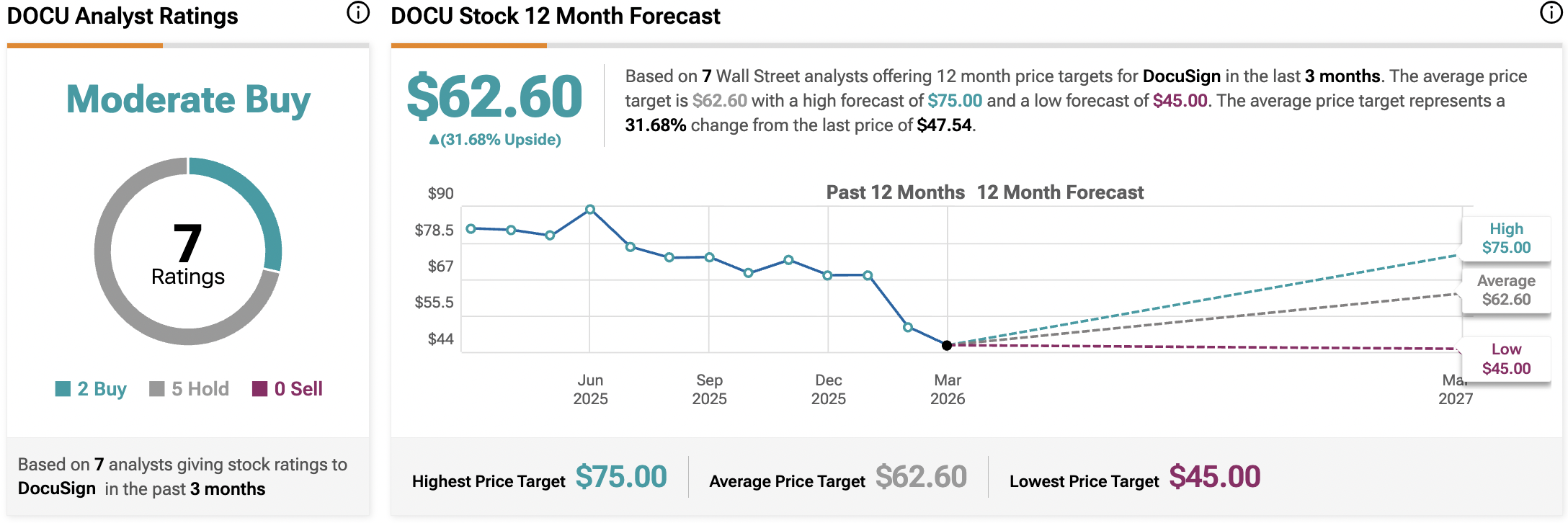 Turning to TipRanks, analysts have a Moderate Buy consensus rating on Docusign stock (DOCU) based on two Buy and five Hold ratings assigned in the past three months, as indicated by the graphic below. Furthermore, the average 12-month DOCU price target of $62.60 per share implies 31.7% upside potential. These analyst ratings are likely to change followed the earnings beat.