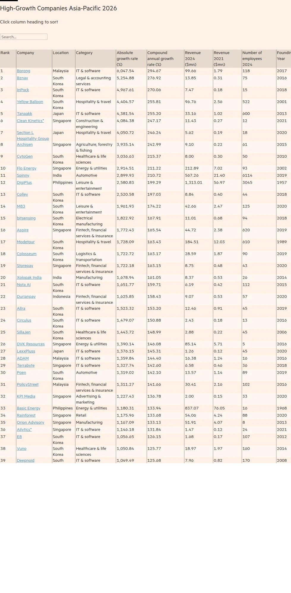 High-Growth Companies Asia-Pacific 2026 is a list of the 500 companies in the Asia-Pacific region that achieved the highest percentage growth in revenues between 2021 and 2024.
