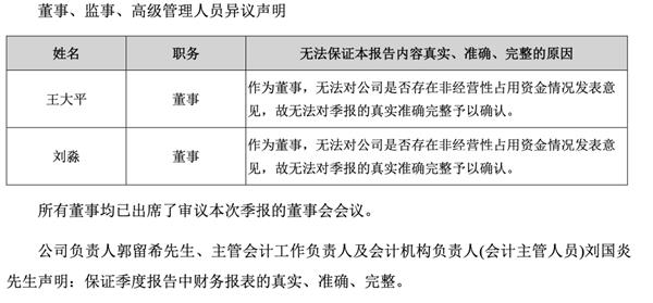 It is worth noting that, according to the board meeting documents, on the eve of disclosing the third-quarter report, October 27, the company convened a board meeting with nine directors, among whom Directors Wang Daping and Liu Miao voted against the third-quarter report. Regarding the reasons for opposition, both parties stated that they could not express an opinion on the issue of non-recurring funds occupation.