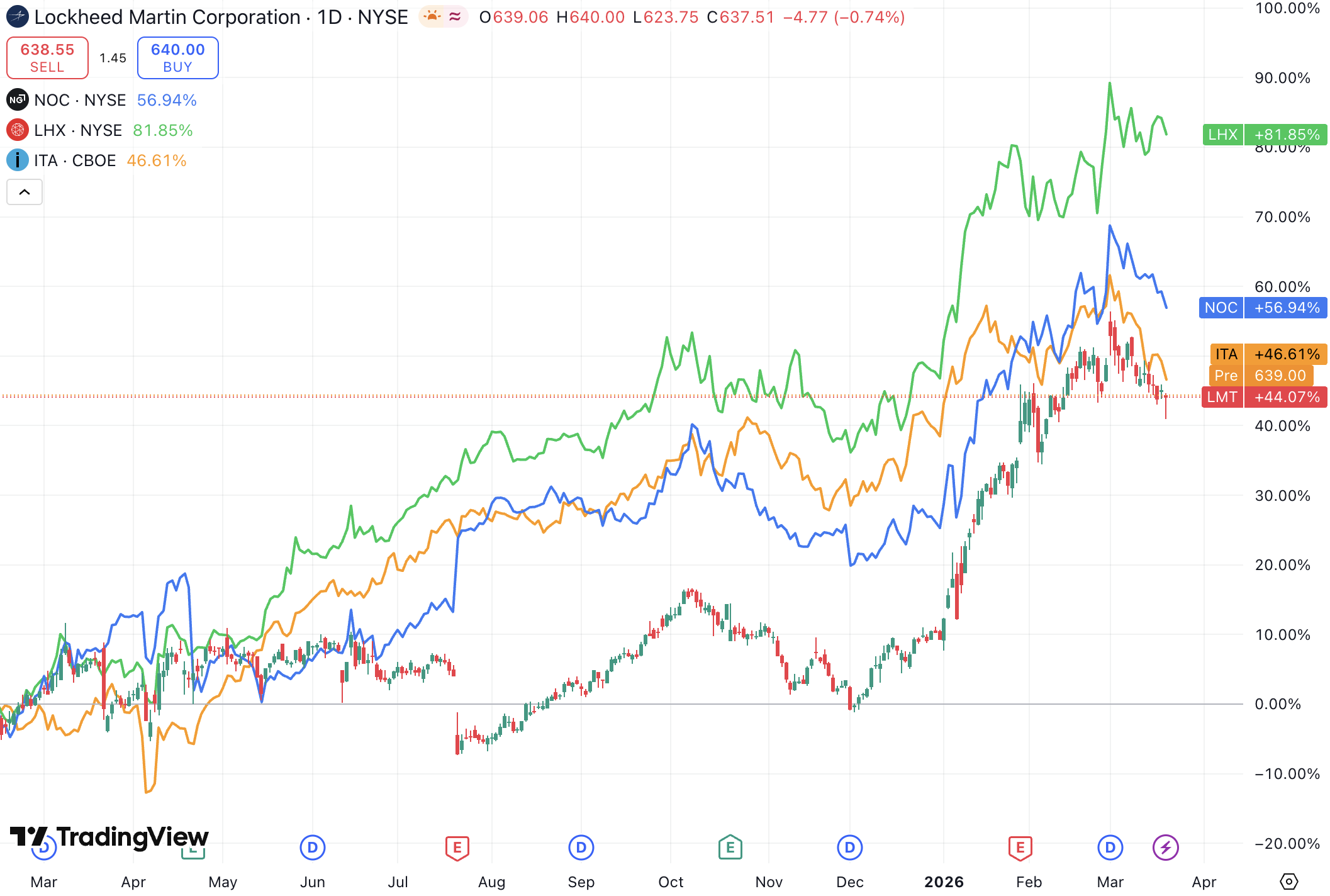 Gold has gained 51% over the past year, and despite a 12% pullback this month, it remains near historic highs. The retreat in gold prices may indicate that “panic trading” is easing—since the war began on March 2, defense and aerospace ETFs have declined at least 5%.