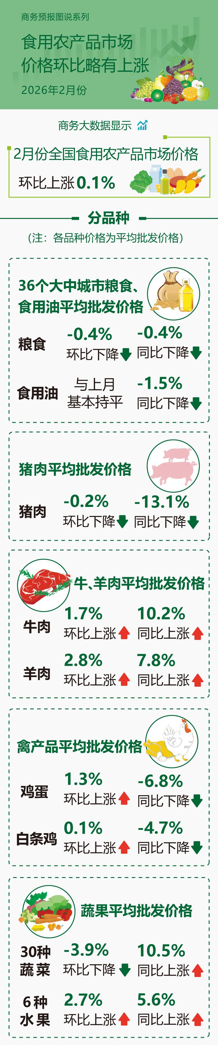 Business big data shows that in February, the national market prices for edible agricultural products increased by 0.1% month-on-month, and the market prices for production materials increased by 0.7% month-on-month.