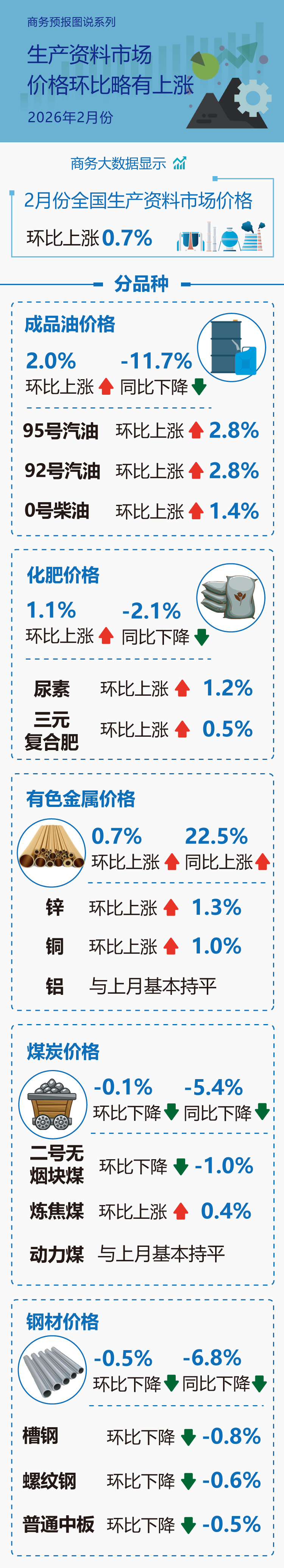 In February, the national market prices for production materials increased by 0.7% month-on-month. Among major varieties, the price of refined oil increased by 2.0% month-on-month and decreased by 11.7% year-on-year, with 95-octane gasoline, 92-octane gasoline, and zero diesel increasing by 2.8%, 2.8%, and 1.4% respectively. Fertilizer prices increased by 1.1% month-on-month and decreased by 2.1% year-on-year, with urea and compound fertilizers rising by 1.2% and 0.5% respectively. Non-ferrous metal prices increased by 0.7% month-on-month and 22.5% year-on-year, with zinc and copper rising by 1.3% and 1.0% respectively, while aluminum prices remained basically the same as last month. Coal prices decreased by 0.1% month-on-month and 5.4% year-on-year, with No. 2 smokeless coal decreasing by 1.0%, coking coal increasing by 0.4%, and thermal coal prices remaining basically the same as last month. Steel prices decreased by 0.5% month-on-month and 6.8% year-on-year, with channel steel, rebar, and ordinary medium plates decreasing by 0.8%, 0.6%, and 0.5% respectively.
