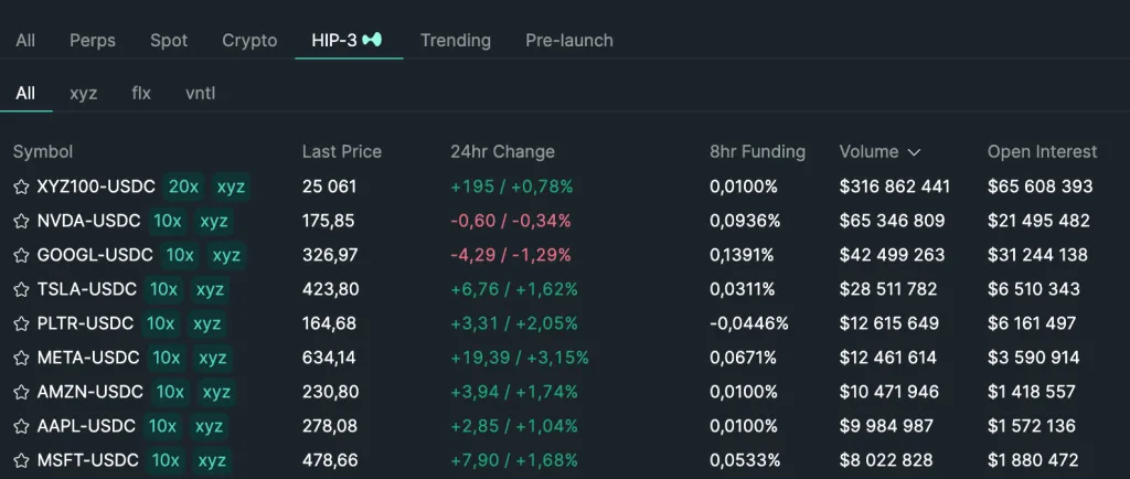 xyz (trade.xyz da equipe Hyperunit/Unit) — focado em índices de ações principais e ações com alto volume de negociação. O token chave — XYZ100, que acompanha as 100 principais empresas não financeiras americanas com alavancagem de até 20x. Os ativos apresentados incluem NVDA, GOOGL, TSLA, PLTR, META, AMZN, AAPL, MSFT e COIN. O mecanismo da plataforma utiliza o livro de ordens on-chain Hyperliquid, os traders operam através de depósitos em USDC. Para estimular a liquidez, é aplicado um “modo de crescimento”, reduzindo as taxas dos market makers em 90%.