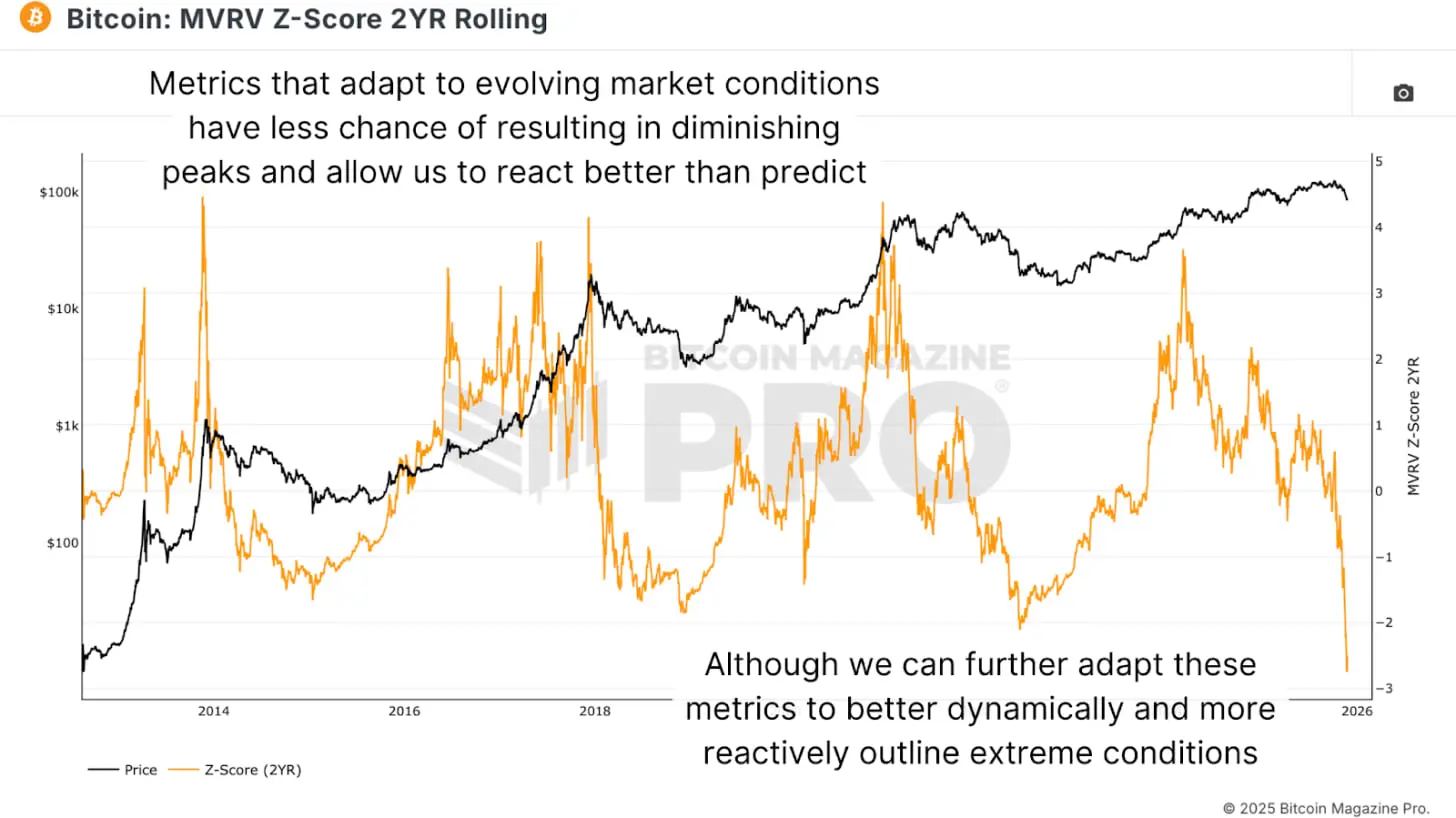 MVRV Z-Score 2 anos indicador em rotação tem sido uma ferramenta central para identificar situações de sobreaquecimento do mercado, mas neste ciclo, não conseguiu liderar bem o pico do mercado em alta. Quando o Bitcoin ultrapassou pela primeira vez a faixa de $73,000–$74,000, este indicador teve um grande aumento, mas não conseguiu fornecer um sinal de saída claro para as altas posteriores. Atualmente, este indicador está apresentando a leitura mais sobrevendida desde que os registros começaram.