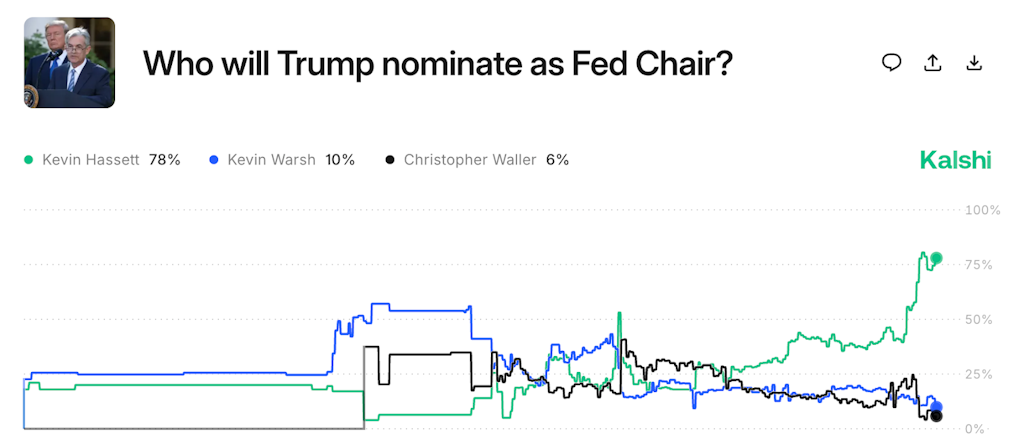 As probabilidades nos mercados de previsão (78% na Kalshi) sugerem que Kevin Hassett será nomeado o próximo Presidente da Reserva Federal. O alinhamento de Hassett com políticas de taxas de juro mais baixas pode ter implicações significativas na valorização de ativos de risco.