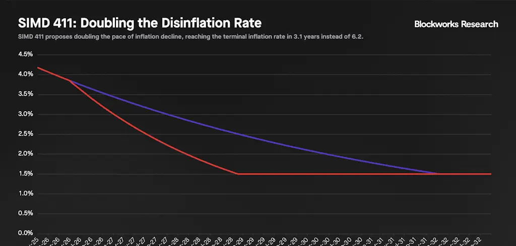 Lostin e Ichigo da Helius propuseram o SIMD411, que visa acelerar o calendário de emissões da Solana, duplicando a taxa de desinflação de -15% para -30%, mantendo a inflação terminal em 1.5%. Esta alteração reduziria a inflação dos ~4.14% actuais para 1.5% em aproximadamente 3.1 anos (início de 2029), em vez do cronograma atual de 6.2 anos (início de 2032).